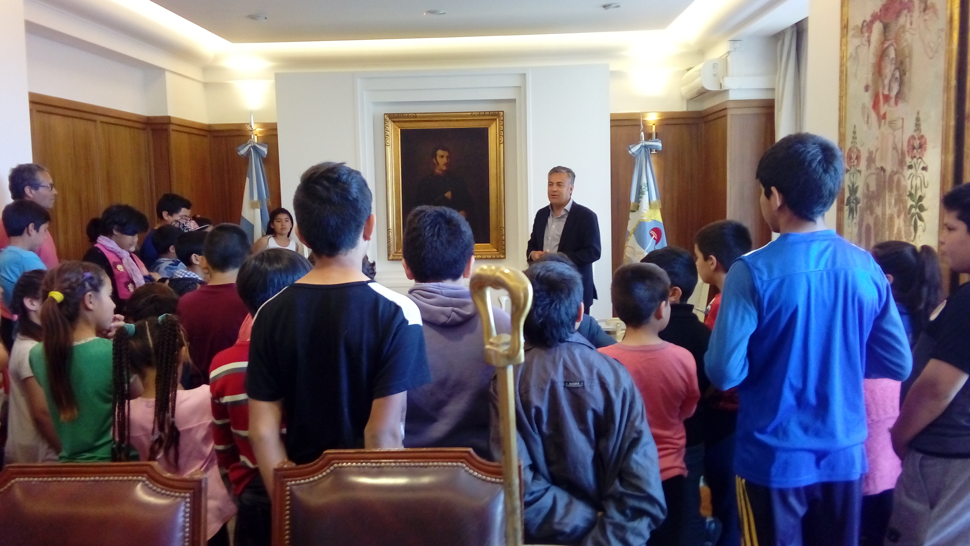 En la jornada de ayer jueves, docentes y alumnos de la Escuela 1-252 “Álvarez Condarco” visitaron la ciudad de Mendoza, como conclusión del proyecto El Cruce de Los Andes. En la oportunidad fueron recibidos en Casa de Gobierno por el gobernador Alfredo Cornejo y el director General de Escuelas Jaime Correas. Además, los niños visitaron también el Memorial de la Bandera y la Basílica de San Francisco, donde pudieron apreciar el sable del General José de San Martín.