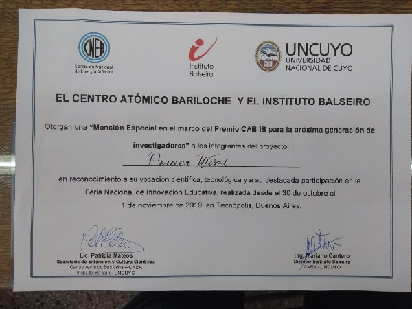 Fue uno de los siete equipos seleccionado entre más de 400 iniciativas que concursaron en el Premio CBA IB para la próxima generación de investigadores de la Feria Nacional de Innovación Educativa 2019, desarrollada en Tecnópolis entre el 30 de octubre y el 1 de noviembre pasados por el Centro Atómico Bariloche, dependiente de la Comisión Nacional de Energía Atómica (CNEA), el Instituto Balseiro y la Universidad Nacional de Cuyo.