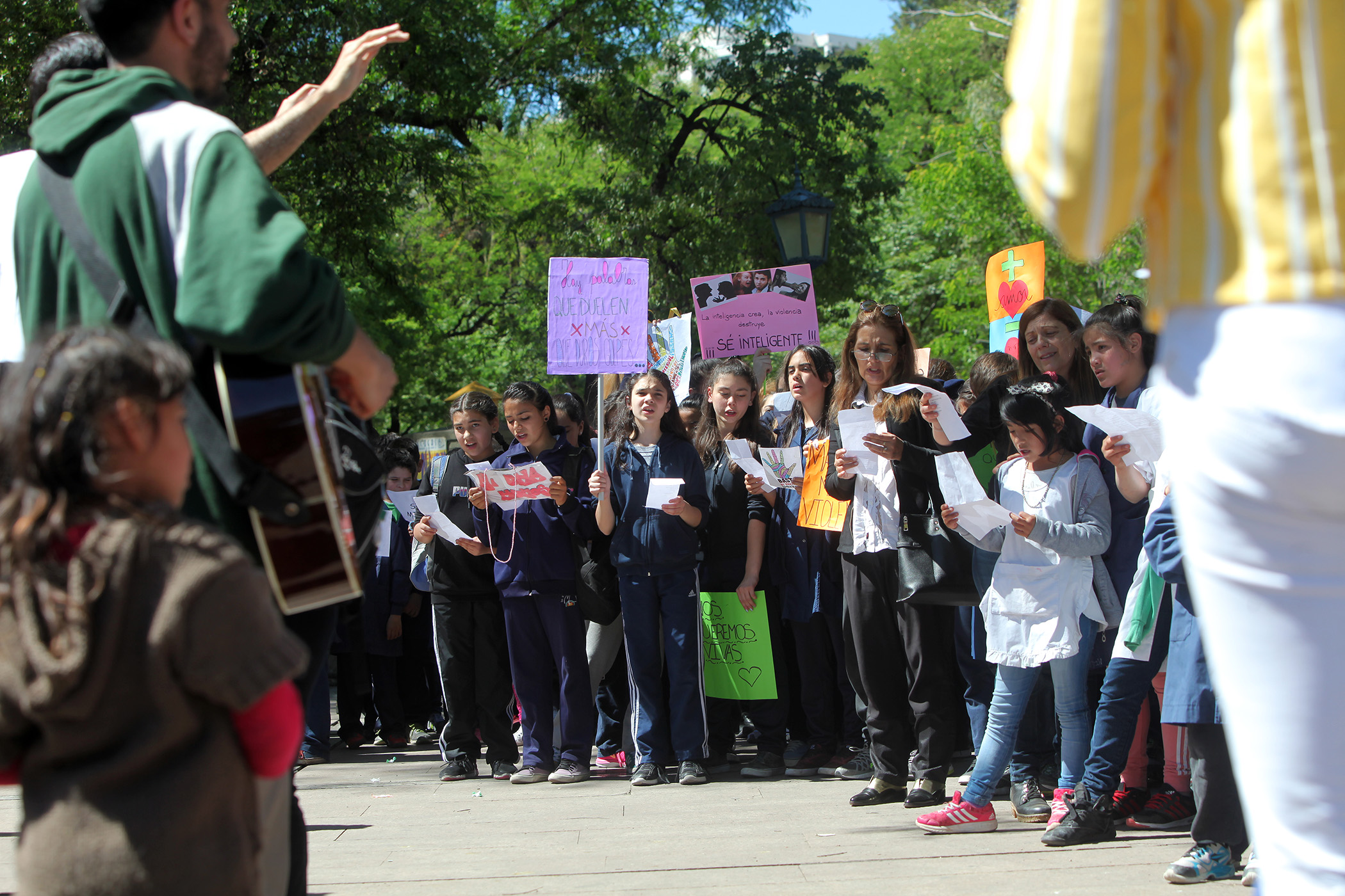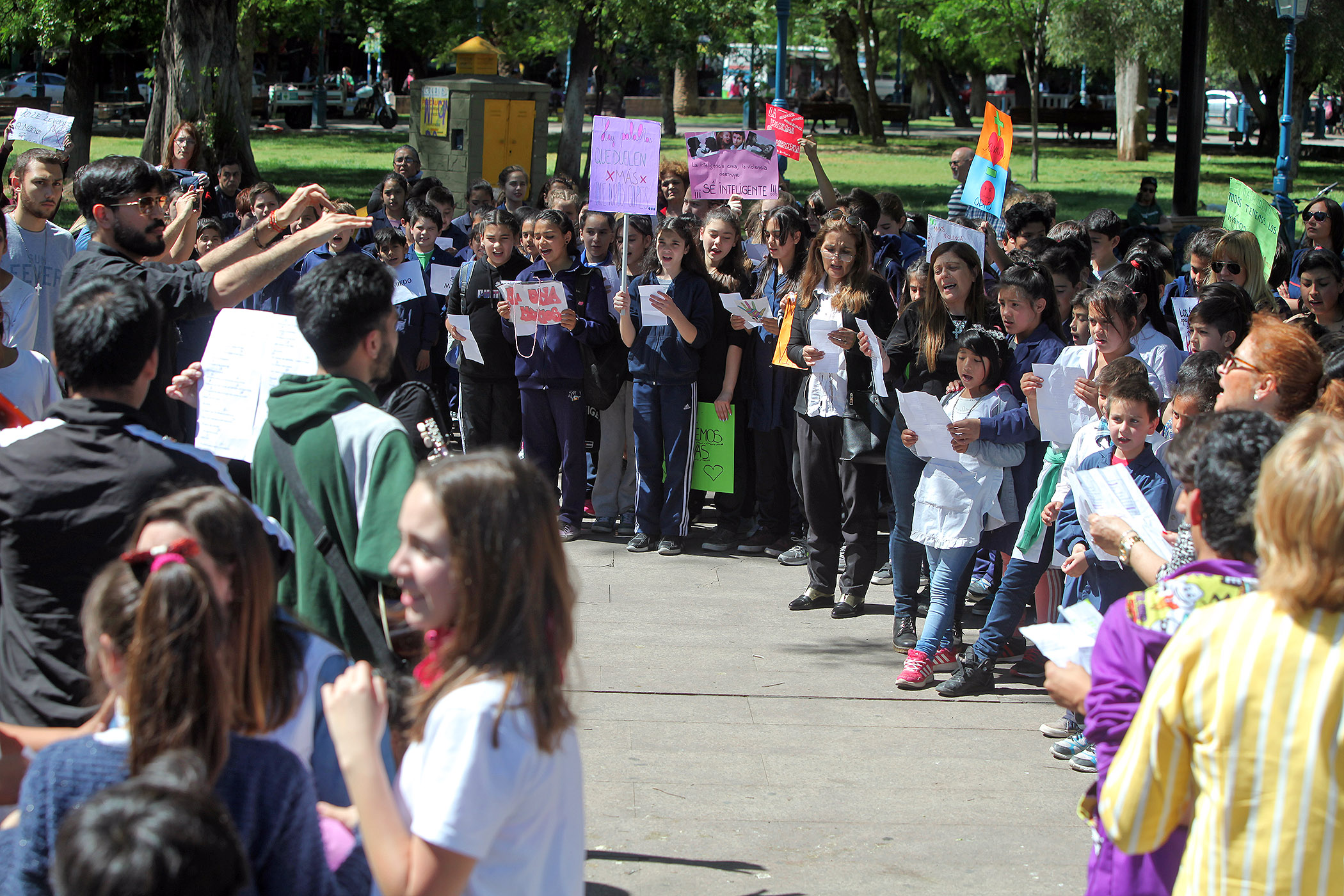Los estudiantes trabajaron el tema a través de la música y realizaron una intervención urbana. También diseñaron folletos explicativos para repartir a los ciudadanos. “Quién ama no mata, ni humilla, ni maltrata” y “hay palabras que duelen más que duros golpes,” fueron algunas de las frases que circularon en el encuentro.
