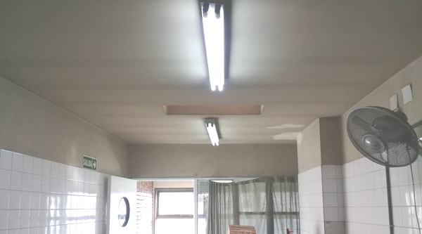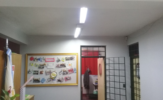 En esta ocasión se realizaron trabajos de electricidad, que implicó la reparación y modificación de luminaria analógica a led en la planta alta del edificio. También se colocaron luminarias de led en la cocina, lavandería, secretaría y en los pasillos de planta baja.